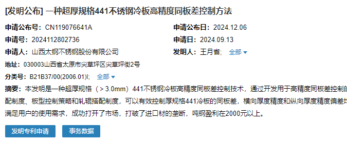 2024年12月6日,山西太鋼不銹鋼股份有限公司成功申請(qǐng)一項(xiàng)名為“一種超厚規(guī)格441不銹鋼冷板高精度同板差控制方法”專利,申請(qǐng)公布號(hào)為CN119076641A,申請(qǐng)日期為2024年9月13日。