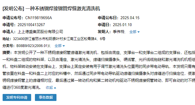 2025年4月15日,上上德盛集團股份有限公司成功申請一項名為“一種不銹鋼焊接鋼管焊縫激光清洗機”專利,申請公布號為CN119819656A,申請日期為2025年1月10日。